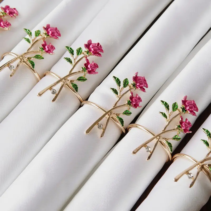 Rond de serviette en métal doré, doté de roses. Idéal pour apporter une touche élégante et florale. Avec ses couleurs attrayantes, il rehaussera votre table et fera mouches auprès de vos invités.